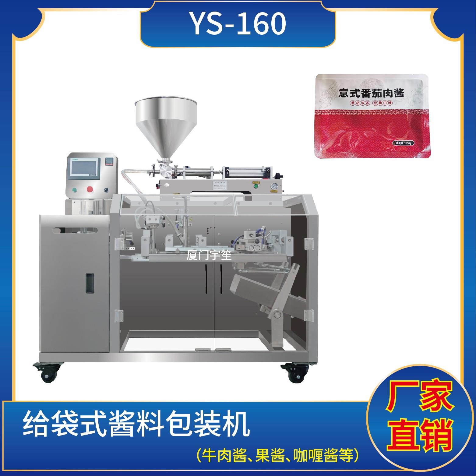 YS-SP160水平給袋式醬料包裝機 (使用鍍鋁、塑膠膜包裝) 1、適用于食品行業(yè)顆粒、粉劑、液體、醬料等物品的計量包裝。2、包裝流程全自動,無需人工操作。可根據(jù)充填物料的性質(zhì)選配不同的下料結(jié)構(gòu)。3、采用觸摸屏操作,PLC控制,封口溫度自動補償,控溫精準,封口美觀大方。4、下料方式:依據(jù)客戶需求選配。5、封口形式:預置…