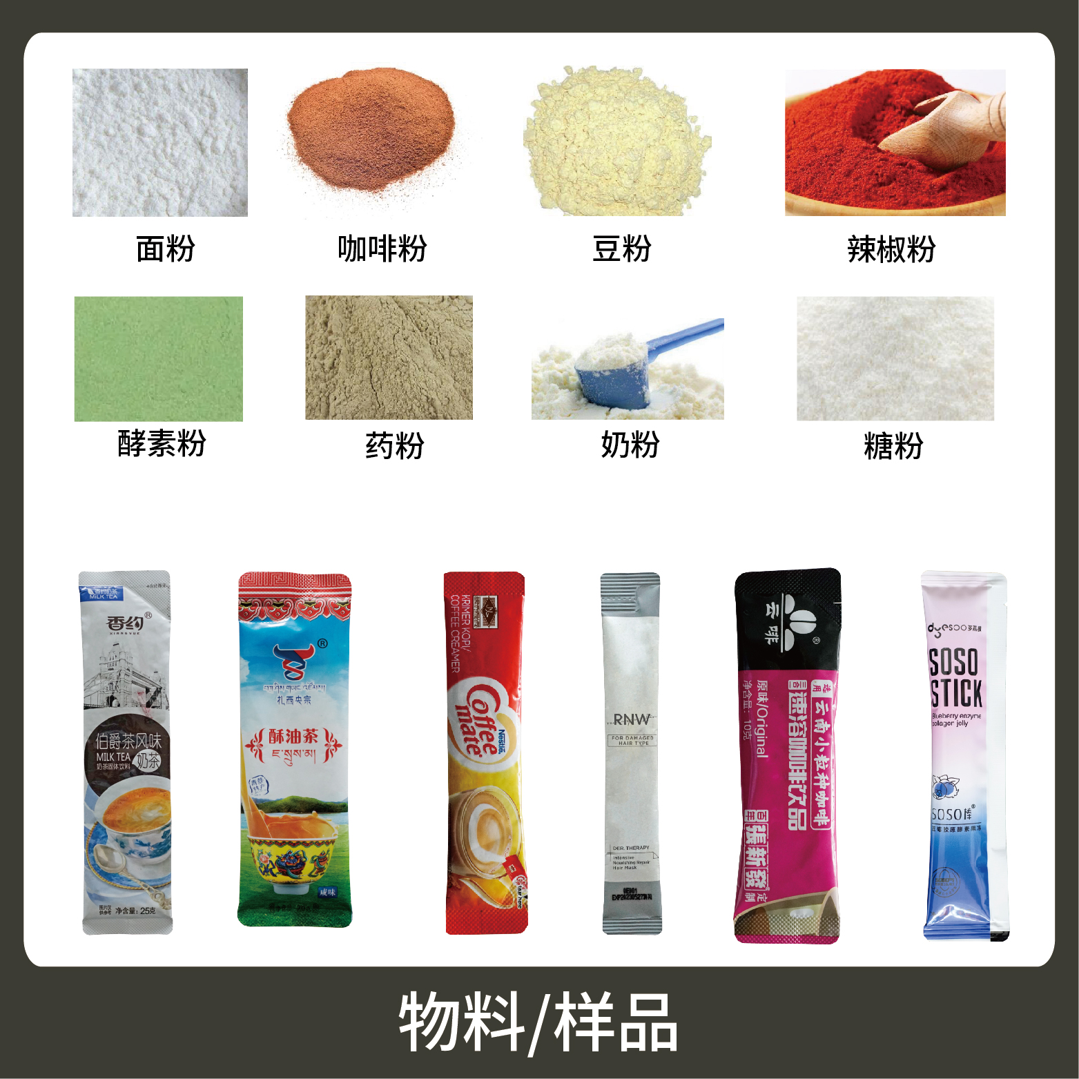 適用于食品、醫(yī)藥、化工、化妝品行業(yè)中粉劑等物品的計(jì)量包裝,如:奶粉、蛋白質(zhì)粉、咖啡粉、藥粉等。